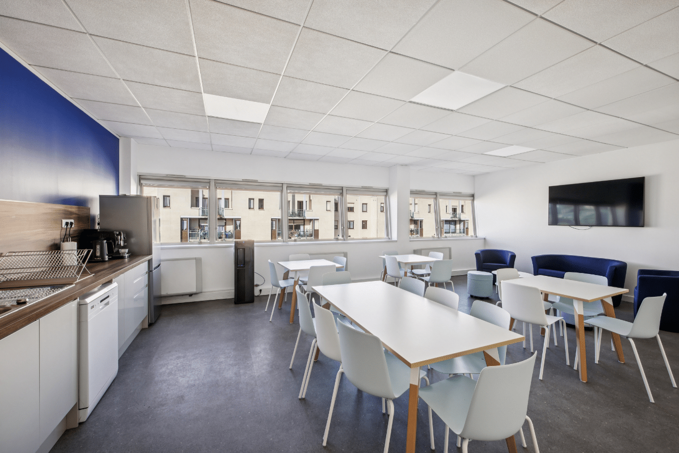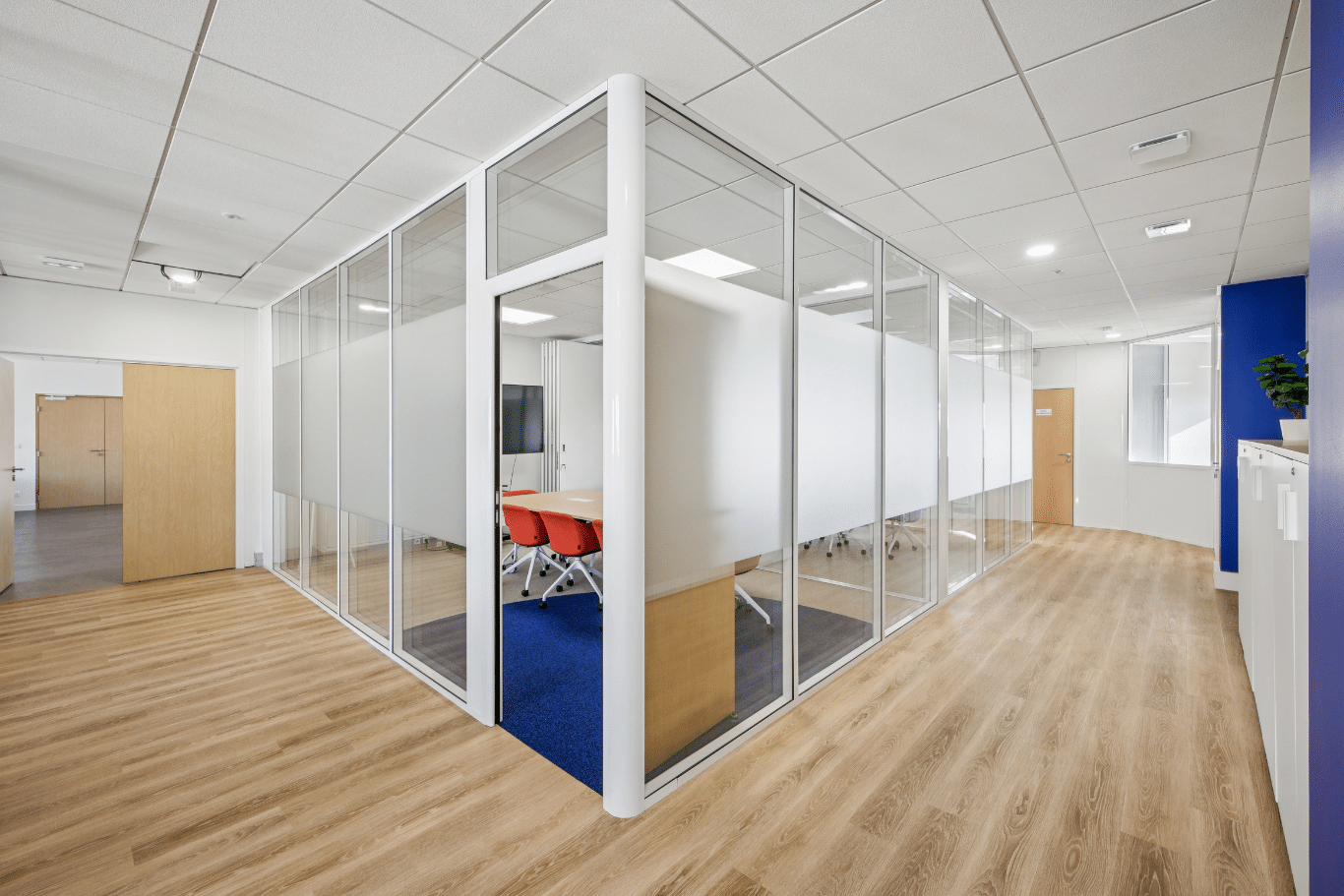 - De la décoration et de la vitrophanie sur les cloisons vitrées pour conjuguer confidentialité et design et des jeux de couleurs ont été faite pour délimiter les différentes fonctions : cuisine d’entreprise, salle de réunion, espace de pause…