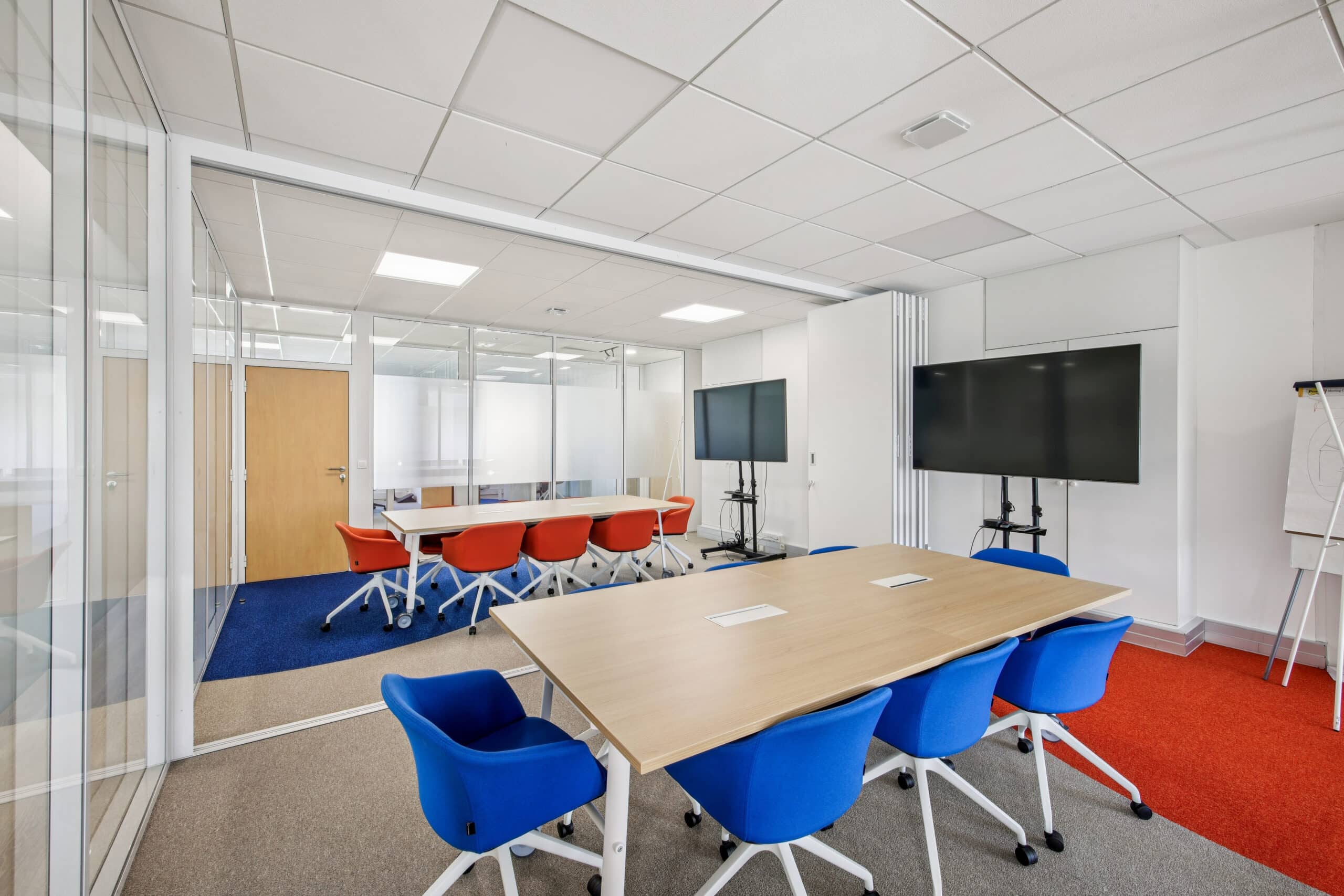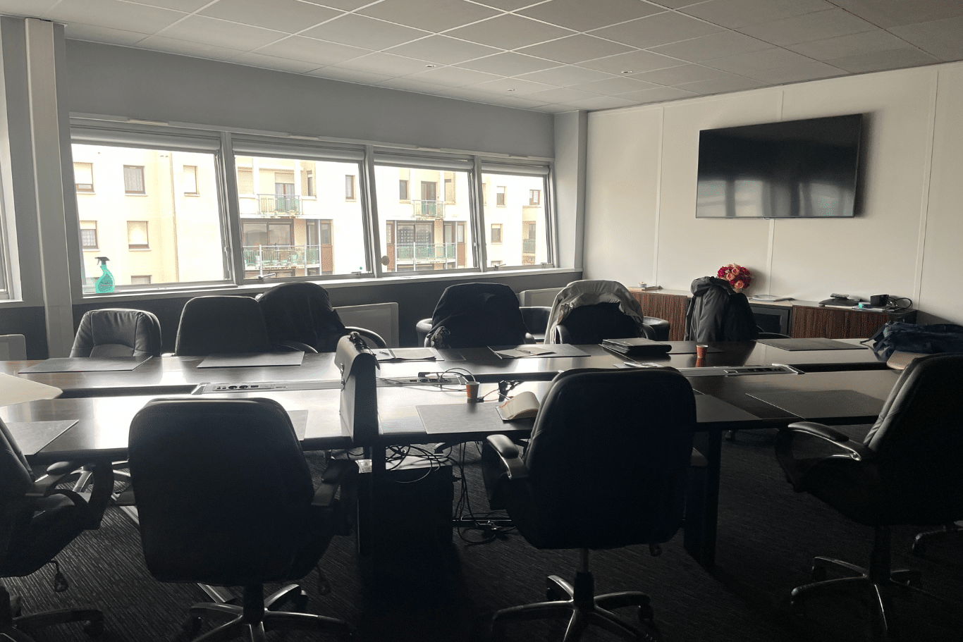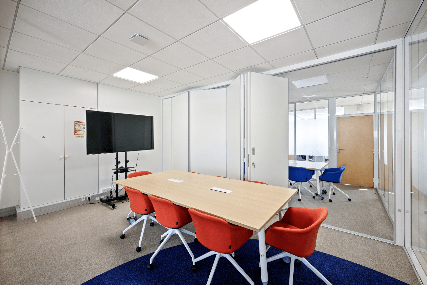 - Un mur mobile a été installé pour permettre la reconfiguration de l’espace réunion selon les besoins (réunion, formation, événement interne…)